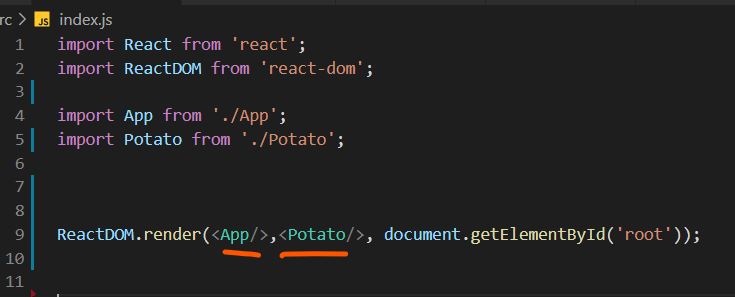 import React from 'react'; function Potato(){ return( <h3> i love potato </h3> ) } export default Potato;App.js