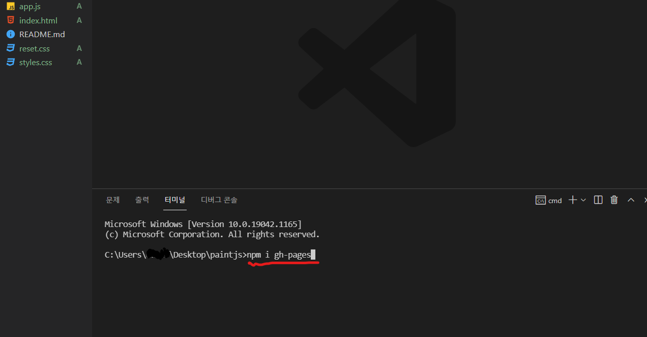 2. npm i gh-pages 를 입력후 엔터! //(여기서 i 는 install 설치를 의미. i 대신 install을 쳐도 됩니다.) -. gh -pages를 설치하는 과정인데.. 설명하자면 내가 github에 업로드 하는것을 허가해주는 모듈이다.(몰라도 됨) - gh-pages는 우리의 웹사이트를 github의 github page 도메인에 나타나게 해준다. - github는 우리에게 무료 웹사이트를 제공함 (ex: static 웹사이트, html, css , js 웹사이트 등..) -일반적으로 동작하는 방식은 github에서 우리의 project 이름을 가져오는 방식임.