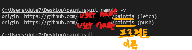3. 프로젝트의 정확한 이름을 체크하기위해 git remote -v 를 입력하고 엔터! (띄어 쓰기 주의)