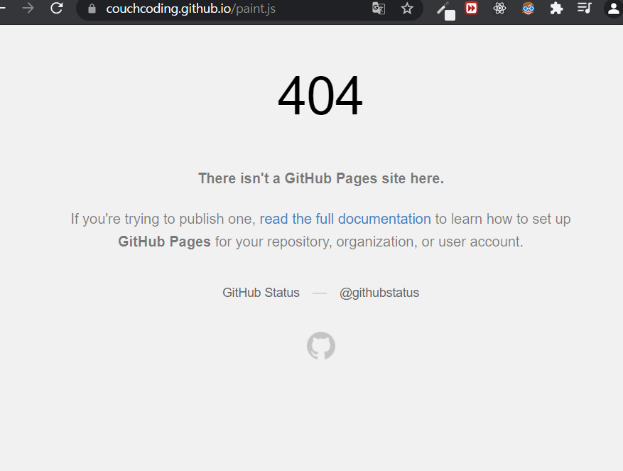 4.https://couchcoding.github.io/paint.js 가 나의 프로젝트 사이트가 될 것이다. (username 부분을 couchcoding 으로 예시를 들어본다면) <--위 사진 참고! (하지만 아래와 같이 404 에러 하면이 뜰 것이다. 왜냐하면 우리는 아직 아무것도 업로드 하지 않았기 때문!)