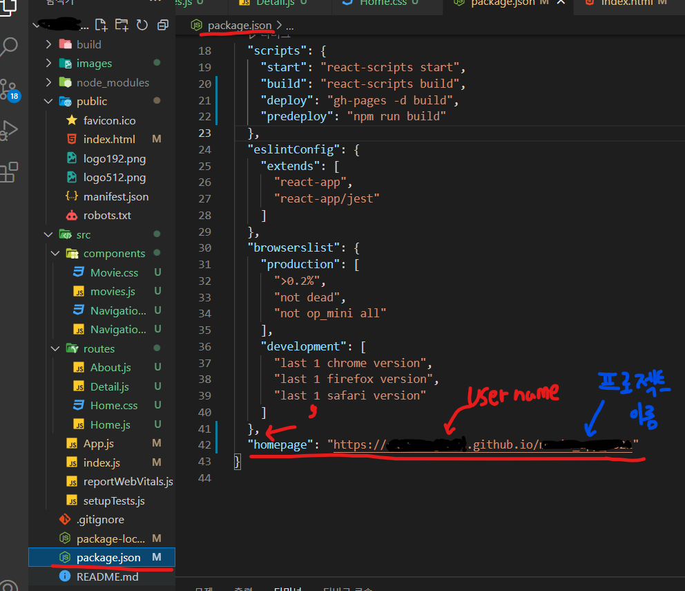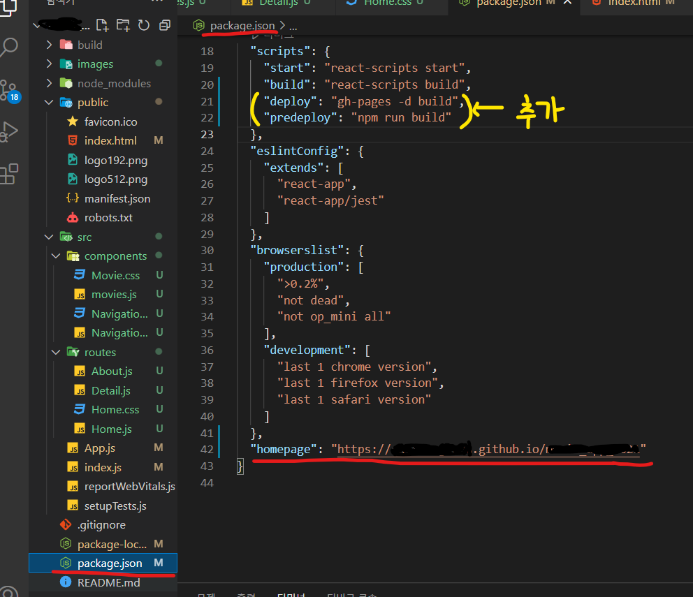 5. package.JSON 으로 가서 home page를 추가한다. (필수!!!)