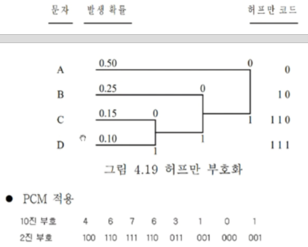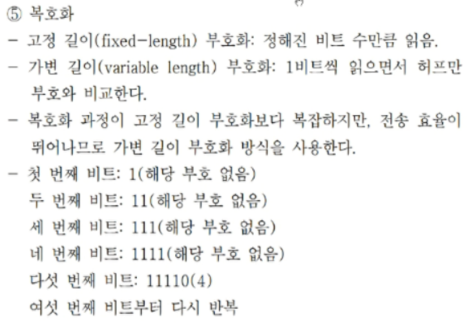 데이터 압축 기술로 널리 쓰이는 허프만 부호화는 문자의 사용 빈도에 따라 가변길이 부호를 적용하는 방식이다.