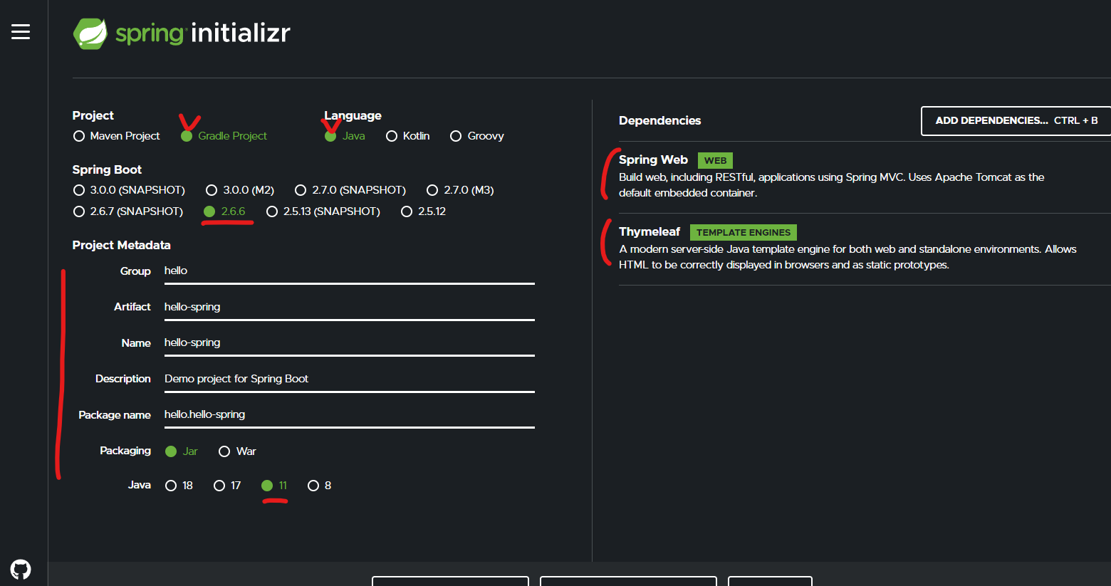 1. spring.io ์ ์ํ ์๋์ ๊ฐ์ด ์ค์ ์ ํด์ค๋ค.