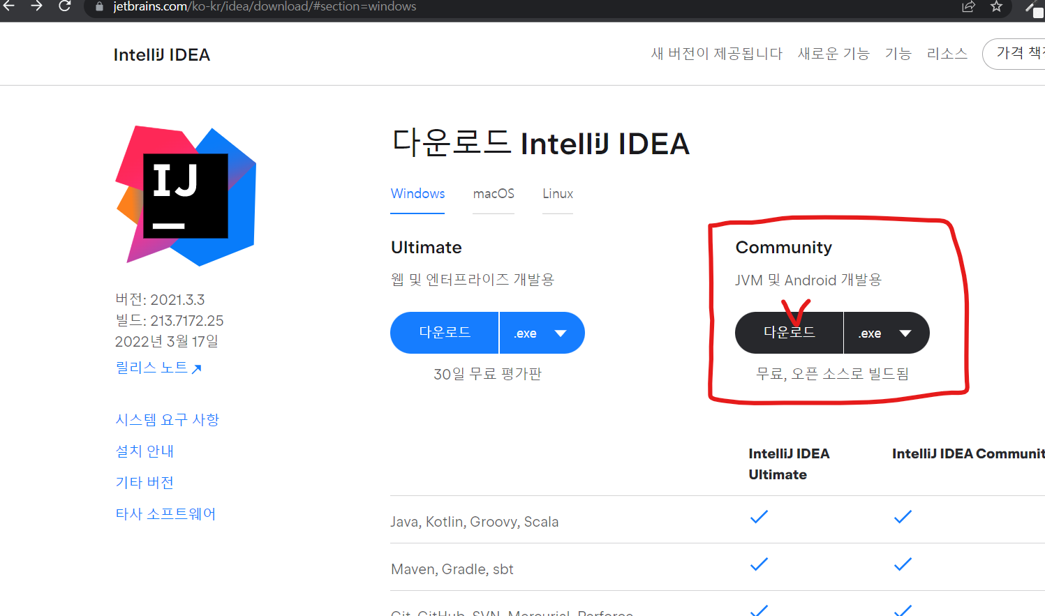 https://www.jetbrains.com/ko-kr/idea/download/#section=windows