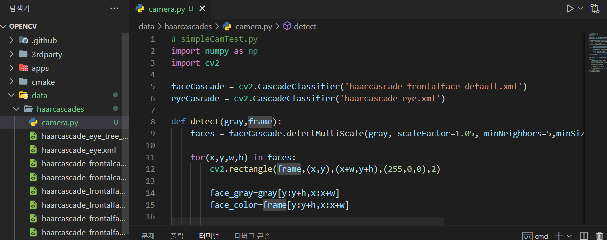๊ทธํ์ ์๋ ์ฌ์ง๊ณผ ๊ฐ์ด opencv/data/haarcascades/ ์ 'camera.py' ํ์ผ์ ์์ฑํด์ค [ํ์ผ ์ด๋ฆ์ ๋ง๋๋ก~]