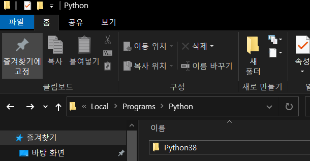 ์ด๋ ์๋์ ๊ฐ์ด python38์ด ์ ๋์จ๋ค๋ฉด ์ ๋๋ก ๋ python ๊ฒฝ๋ก๋ฅผ ์ฐพ์์ ํ๊ฒฝ๋ณ์์ ์ ์ฉ์์ผ์ฃผ์ด์ผํ๋ค.)