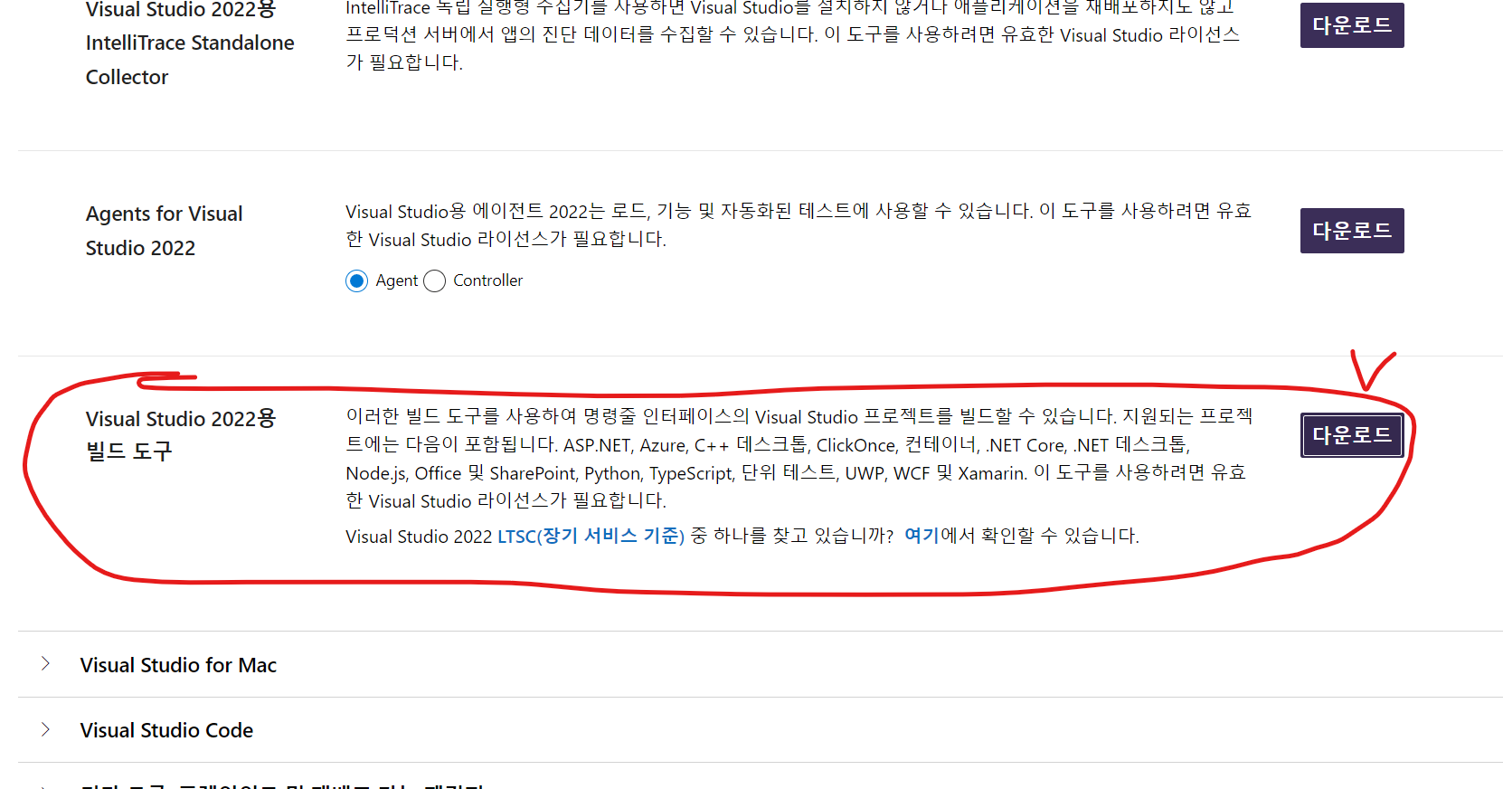 https://visualstudio.microsoft.com/ko/downloads/ ์ฌ๊ธฐ ๋ค์ด๊ฐ์ ์ ์ฌ์ง ์ ์ฐธ๊ณ ํ์ฌ ๋ค์ด๋ก๋/์ค์น ํ๋ค.