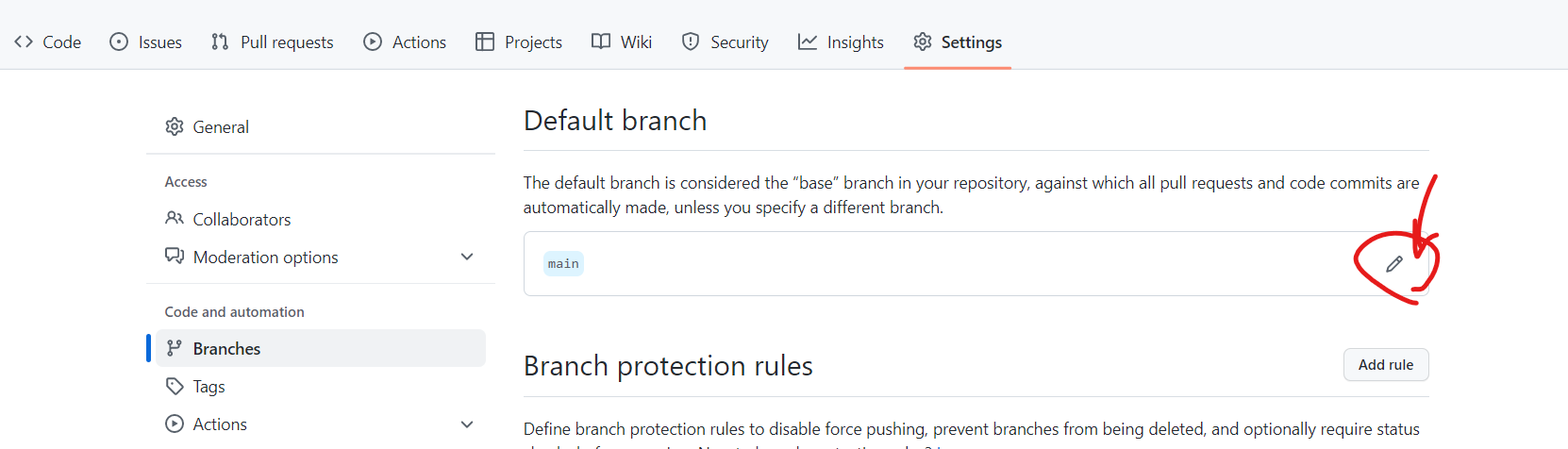 변경하고자 하는 레포지토리에 들어가서 > SETTING(설정) > Branches 카테고리 > 사진에 표시해둔 동그라미 클릭