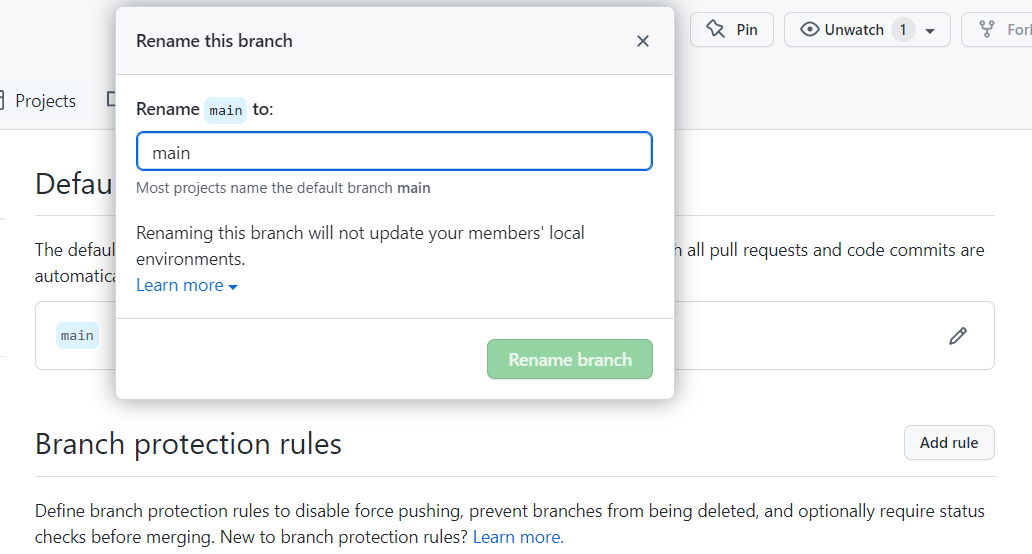 'master' 를 지우고 'main' 으로 입력후 'Rename branch' 클릭