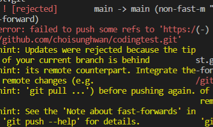 Branch 변경후 git push 실행시 위와 같은 에러 발생시. git pull 을 한 후 git push를 하면 해결완료!