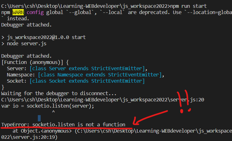1. npm link socket.io  ๋ช…๋ น์–ด๋ฅผ ์น˜๋ฉด ํ•ด๊ฒฐ๋œ๋‹ค๊ณ  ํ•œ๋‹ค. => ํ•˜์ง€๋งŒ ์‹คํŒจ.