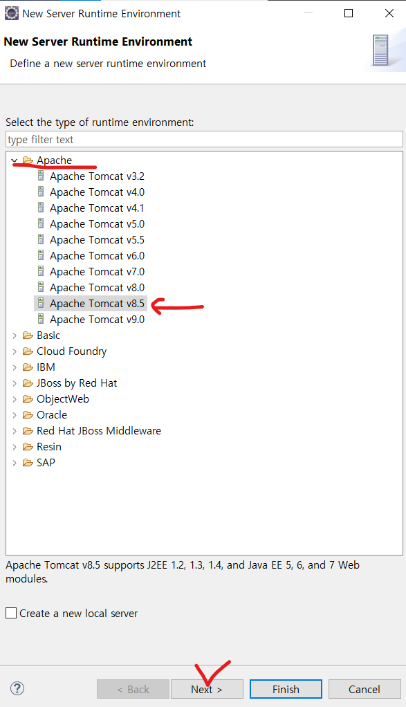 9. apache 아래 에 본인이 설치한 버전을 클릭합니다. [저는 아파치 톰캣 8.5버전을 설치했기 때문에]