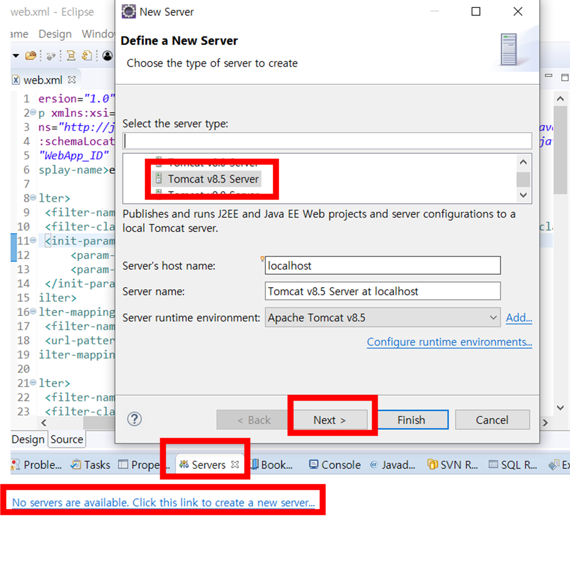 + 하단 servers 탭 > No servers...> tomcat 버전 확인후 > next