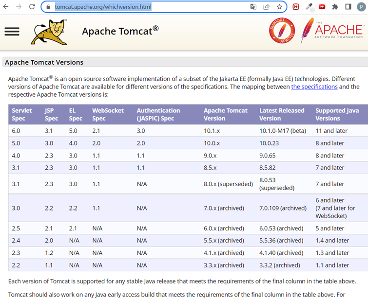 1. Apache Tomcat 버전과 적합한 버전 찾기. [https://tomcat.apache.org/whichversion.html]