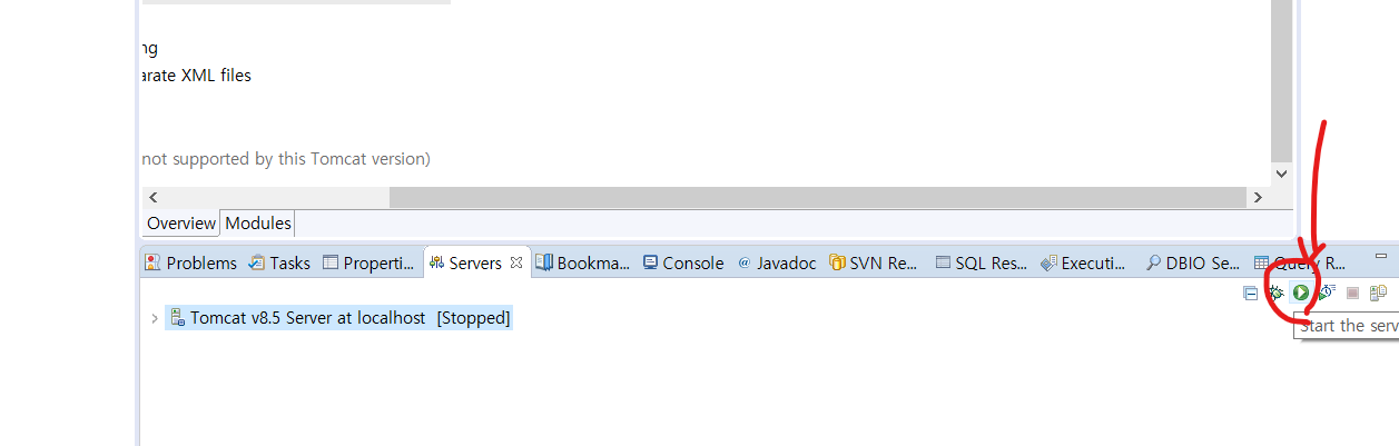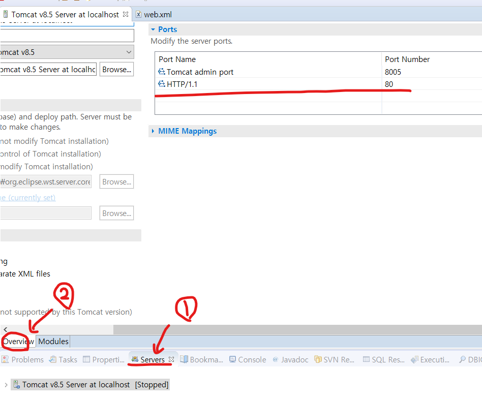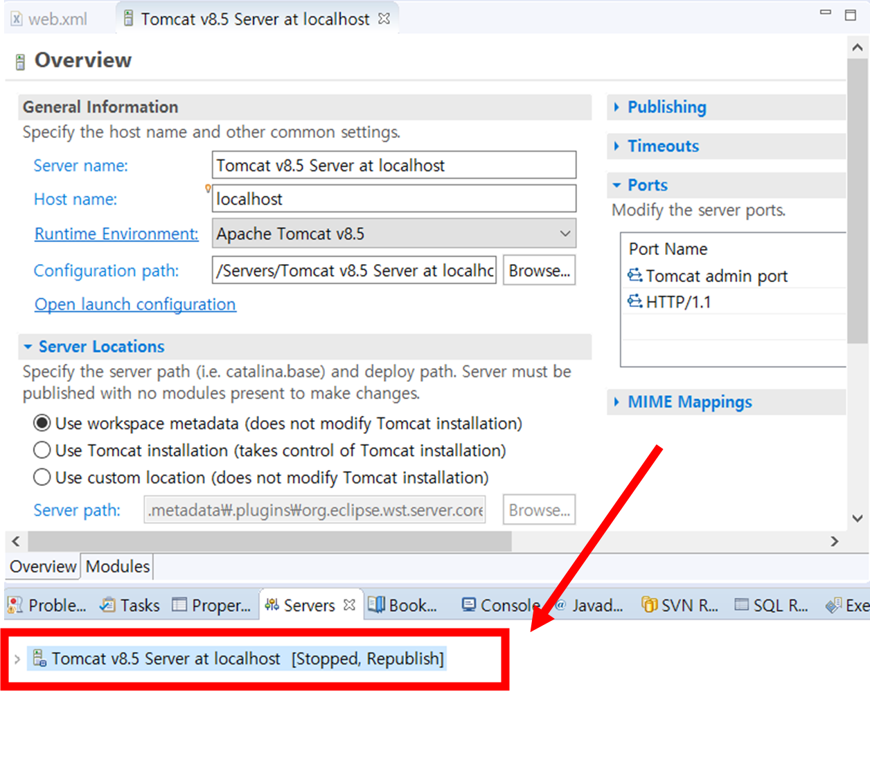 servers 하단 탭 > tomcat v.8.... 더블 클릭> 아래 화면 나옵니다.
