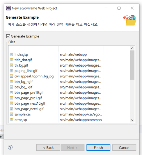 4. 그리고 Generate Example 체크박스에 체크 하신후, Finish 버튼 클릭하시면 웹서버 프로젝트가 생성됩니다.
