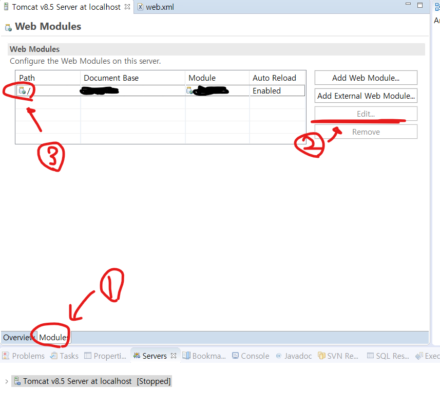 12. 똑같이 하단 servers 에 이번에는 Modules 클릭> edit 버튼 > path 를 / (루트) 로 설정해줍니다.