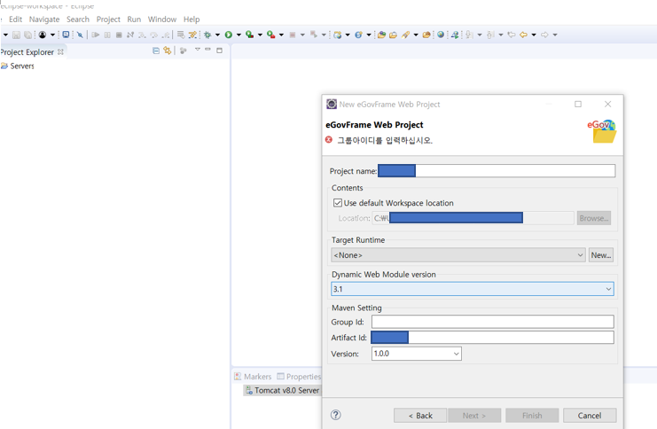 3. project name 작성 후, 경로 확인 , Dynamic web Module version 은 1.번☝에서 본인에 알맞은 버전으로 선택해주면 됩니다. (저는 apache tomcat 8.0 버전을 사용하므로 모듈 3.1 버전을 선택하였습니다.)