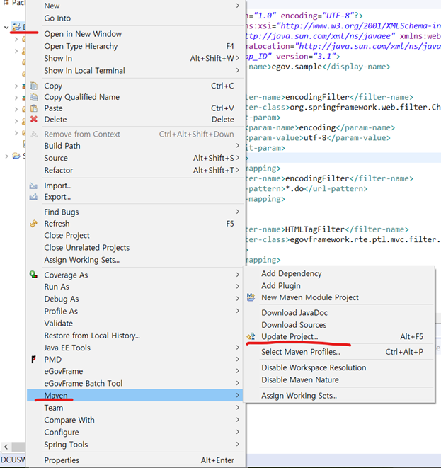 5. 좌측에 생성된 프로젝트 아래 폴더에 보시면 src 폴더 > webapp폴더> WEB-INF에 보시면 web.xml 파일이 있습니다.