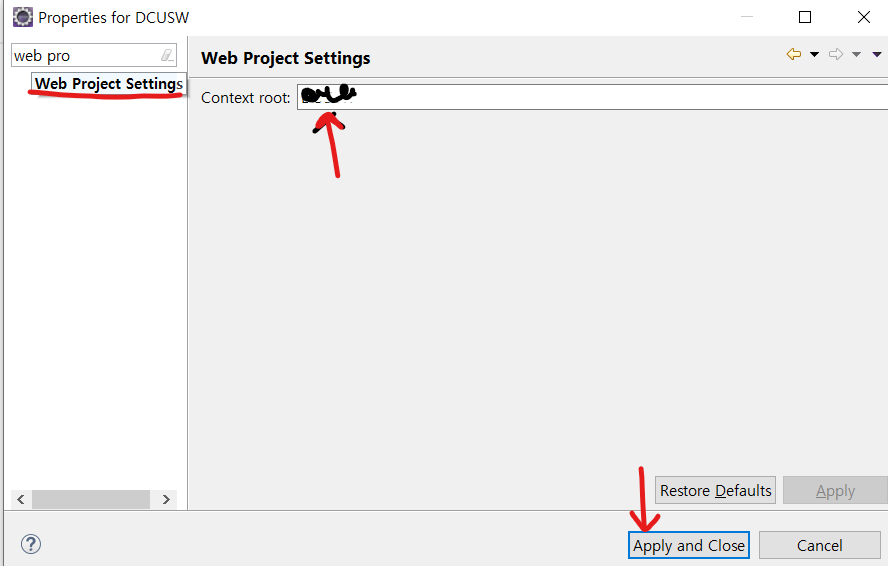 7. 그리고 properties [Alt+enter] > web project setting > context root 에 본인의 프로젝트 이름과 동일한지 확인합니다.