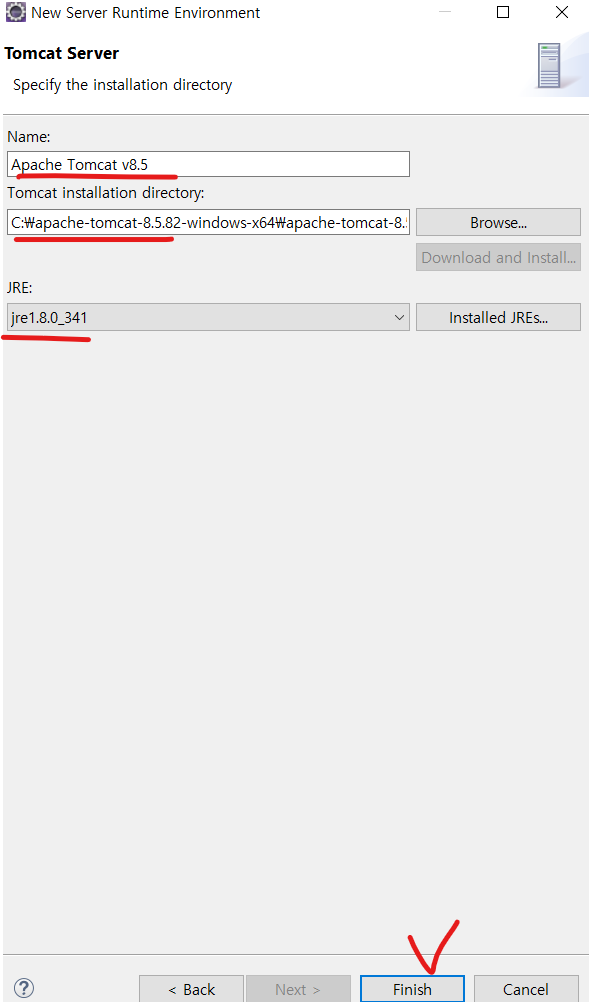 10. name 확인, 경로 확인, jre 설정 확인 후 Finish 클릭