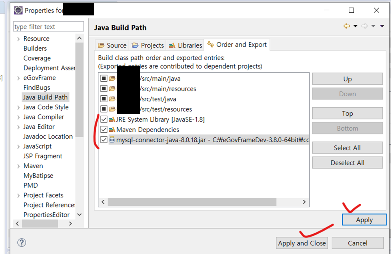 이전에 설치한 전자정부 프레임워크 를 실행 > 프로젝트 우측클릭> properties > java build path > libraries 탭>