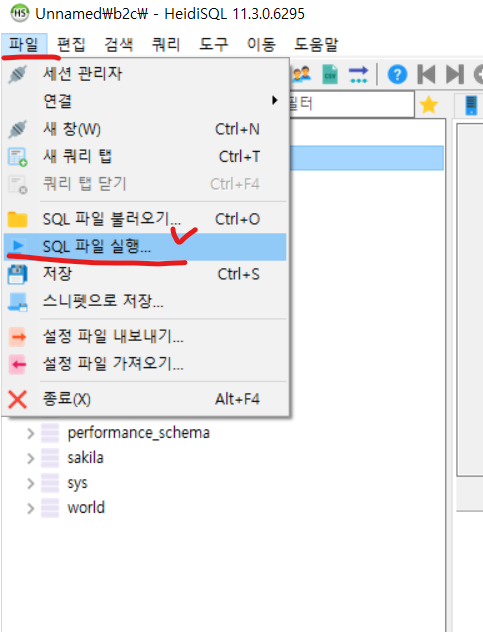 4. 파일 > SQL 파일 실행 > 가져오고자 하는 sql 파일 선택