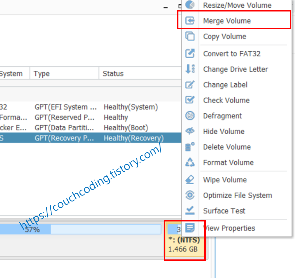 1. ์ ์ฐ์ธก ๋์ ์์นํ *:(ntfs) ์ฐ์ธก ํด๋ฆญํด์ Merge volume ์ ํด๋ฆญํด์ d ๋๋ผ์ด๋ฒ์ ๋ณํฉ์ํจ๋ค.