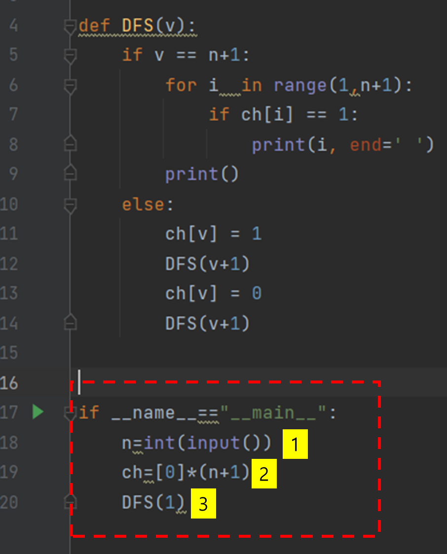 12๋ฒ์ค: DFS(2+1) ๋ก DFS(3)์ด ๋๊ณ , DFS(3)์ ๋ค์ 4๋ฒ์ค์ ์์นํ ํจ์ DFS(v)๋ฅผ ํธ์ถํ๋ค.