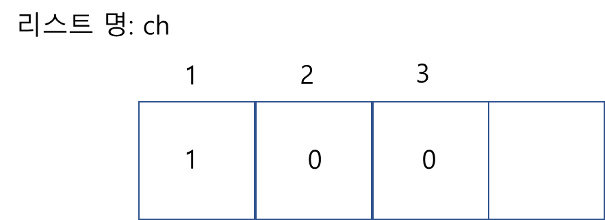 10๋ฒ์ค: ch[3] =1 ์ด๋ฏ๋ก ์๋ ์ฌ์ง์ฒ๋ผ 3๋ฒ์ 1์ ์ฐ์ด์ค๋ค.