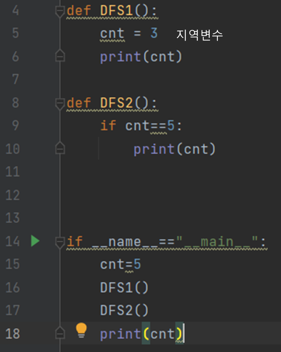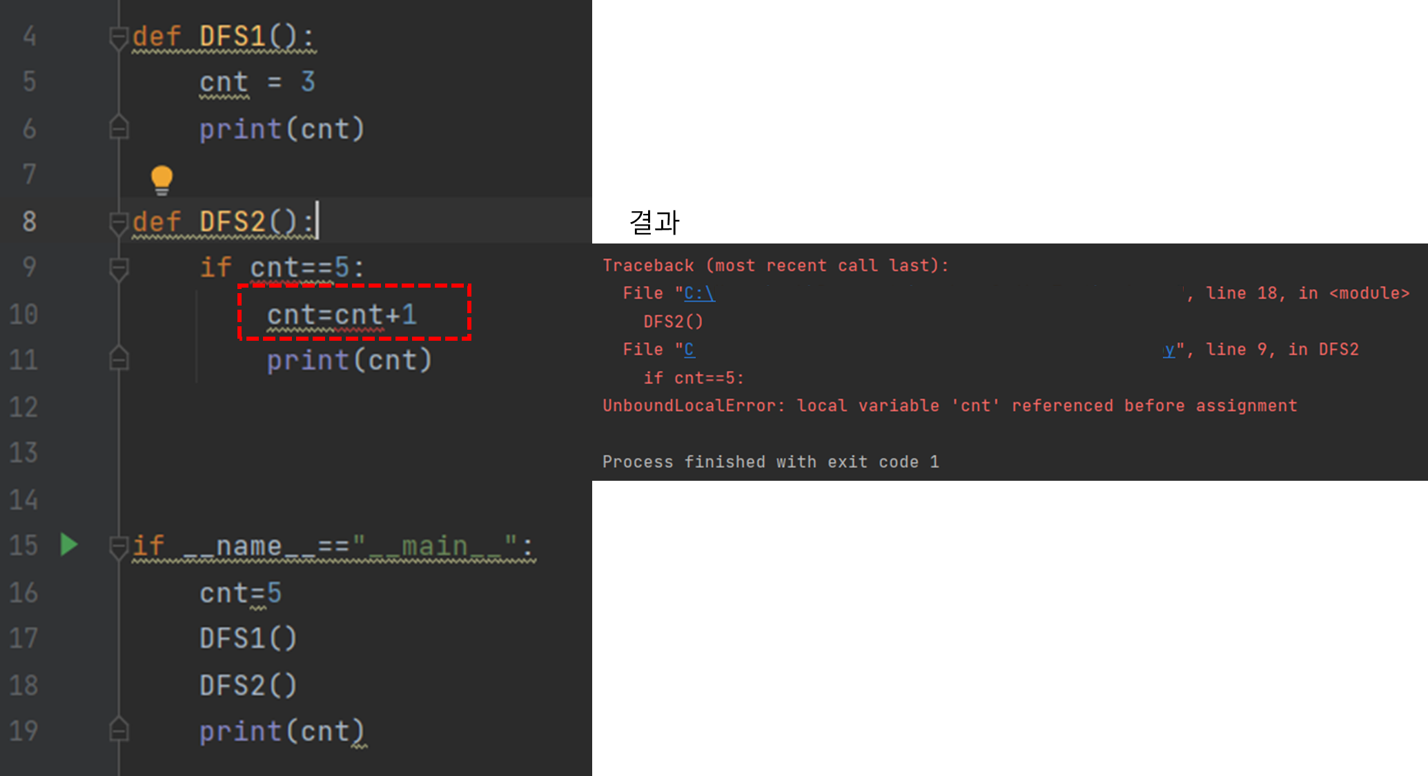 cnt = cnt +1 ์์ cnt๋ ์ง์ญ๋ณ์ ์ ์ธ์ผ๋ก ๋ณผ ์ ์๋ค. ๊ทธ๋ฐ๋ฐ ์ง์ญ๋ณ์ ์ธ cnt์ ๊ฐ์ด ์ด๋์๋ ์ ์ธ๋์ด ์์ง ์๋ค.