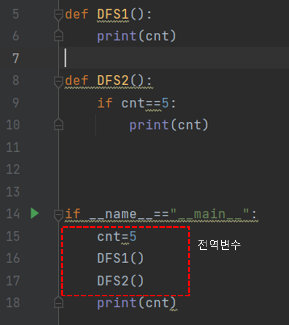 ๊ทธ๋ฌ๋ฉด 6๋ฒ์ค ๋ณ์ cnt๋ ์ถ๋ ฅํ ๋ 15๋ฒ์ค์ cnt=5 ๋ฅผ ์ถ๋ ฅํ์ง ์๊ณ ์ง์ญ๋ณ์ 5๋ฒ์ค cnt=3 ์ ๋ถ๋ฌ์์