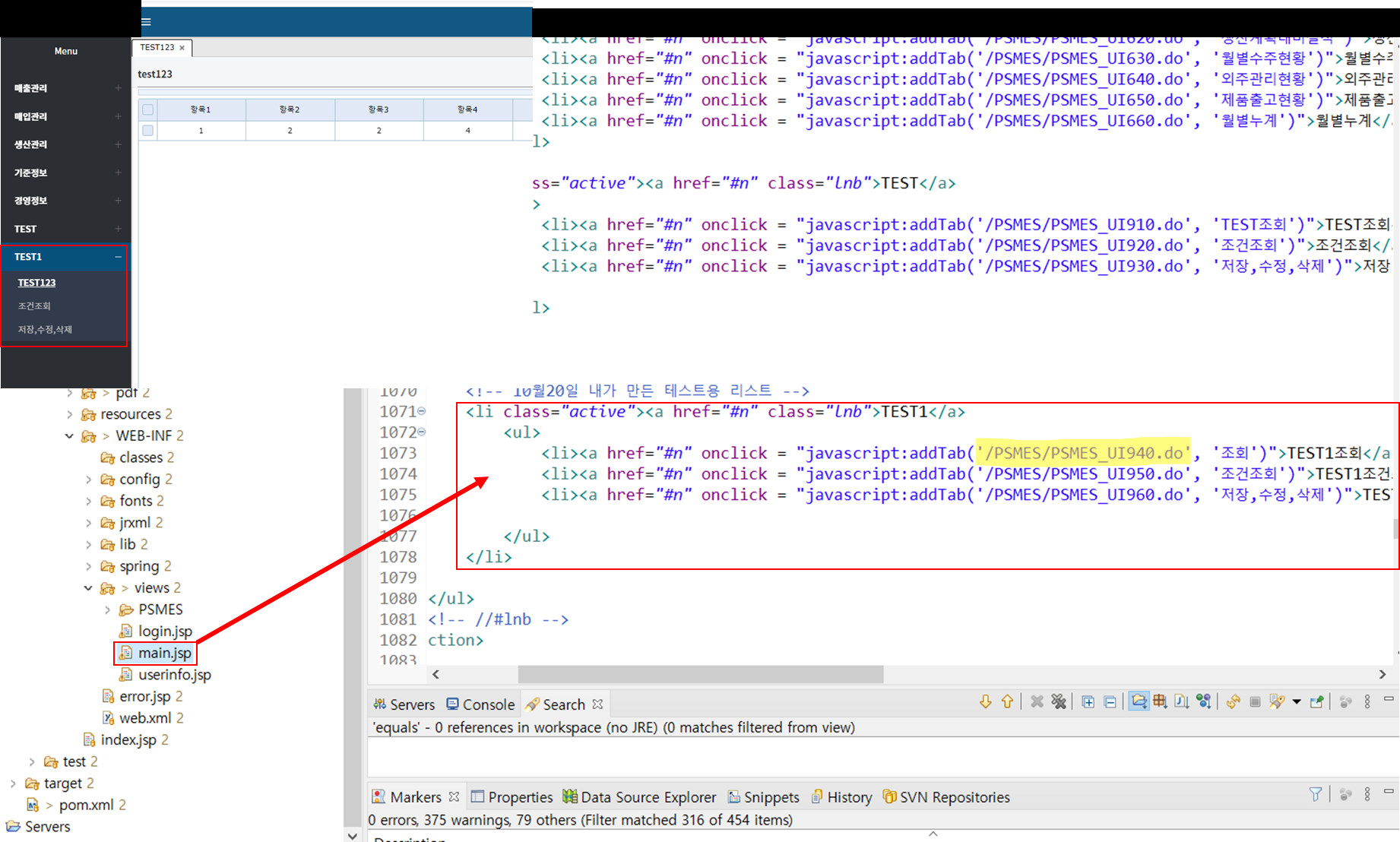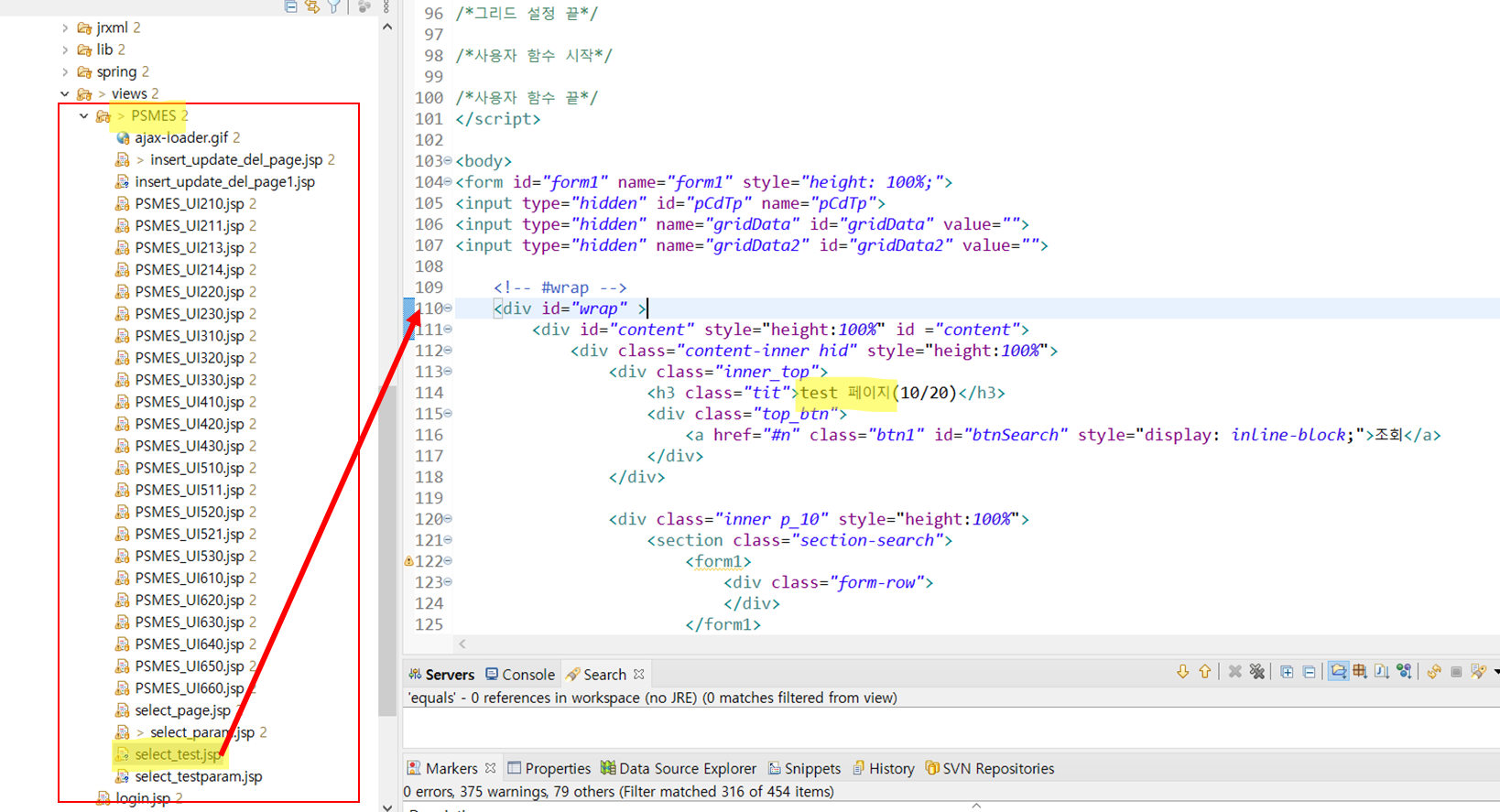 PSMES 폴더 안에 select_test 파일로 이동하였다. 보니까 아까 카테고리에서 '조회' 를 클릭시 이 파일이 실행되면서 view단에 보여짐을 짐작할 수 있다.