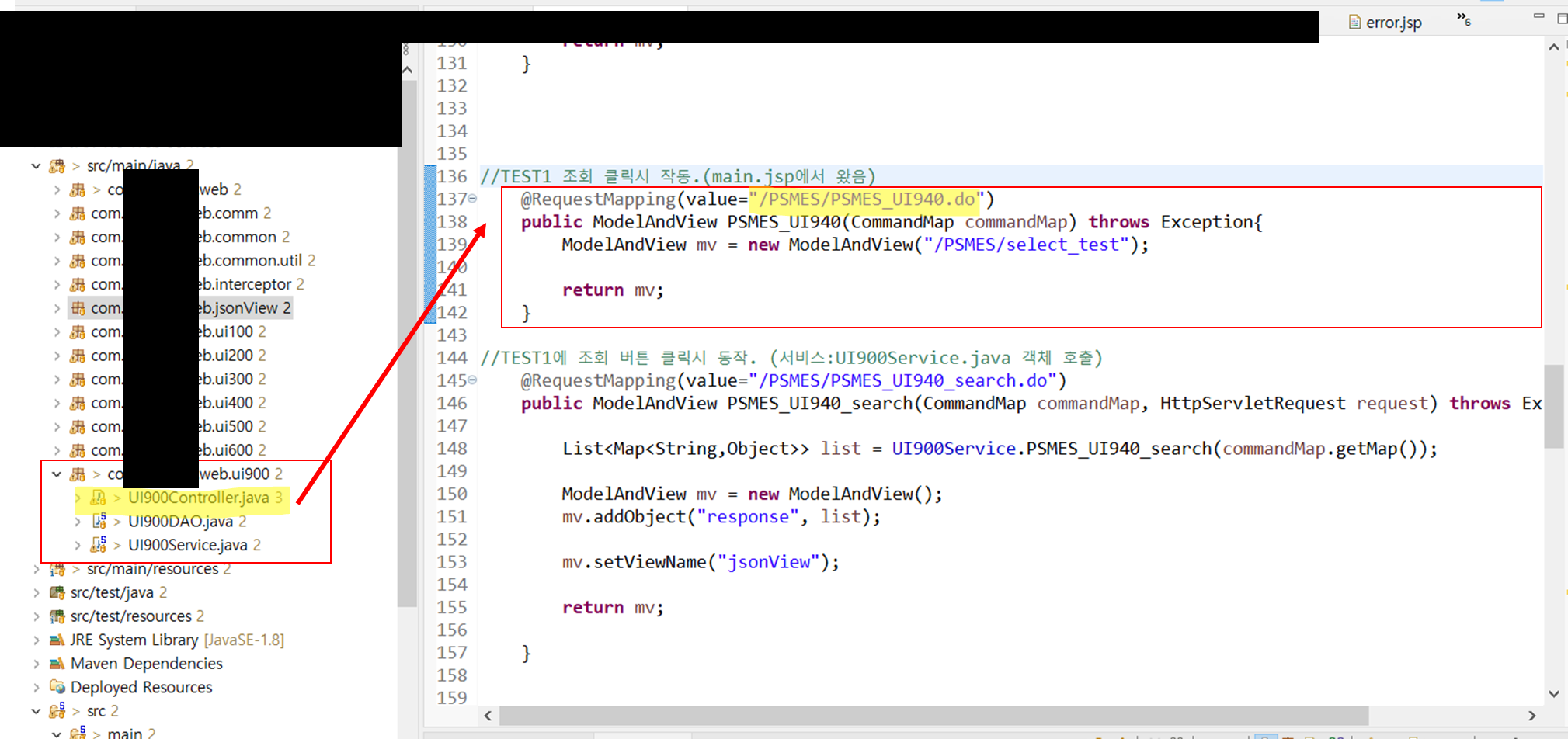 해당 컨트롤러 파일을 보면 값(/psmes/psmes_ui940.do)이 매핑됨을 확인 할 수 있다.