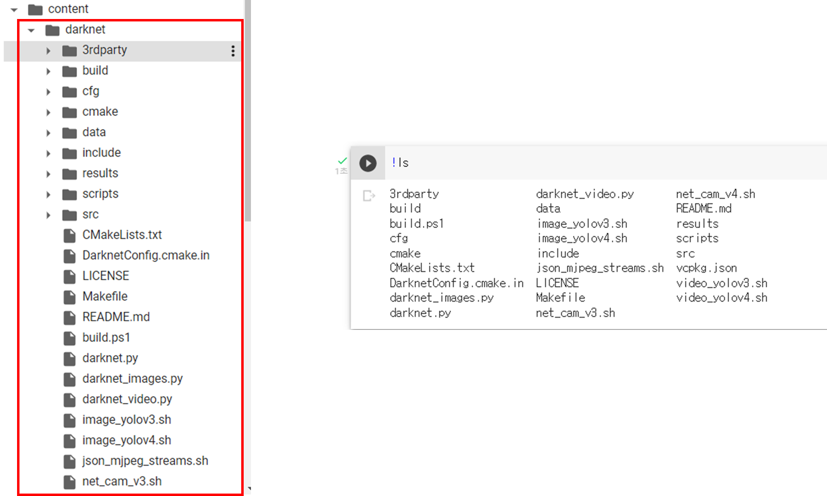 ๊ทธ๋ฌ๋ฉด ์ค์นํ darknet์ด content ํด๋ ์๋์ darknetํด๋๊ฐ ์์ฑ๋จ์ ํ์ธํ ์ ์๋ค.