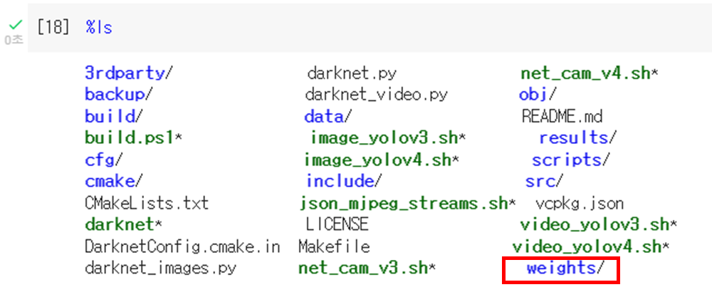 darknet ํด๋์ ํด๋orํ์ผ ๋ฆฌ์คํธ ๋ค์ ํ์ธ ํด๋ณด๋ฉด ์ฐ์ธก ํ๋จ ๋ฐ์ weights ํด๋๊ฐ ์์ฑ ๋์์์ ํ์ธ ํ ์ ์๋ค.