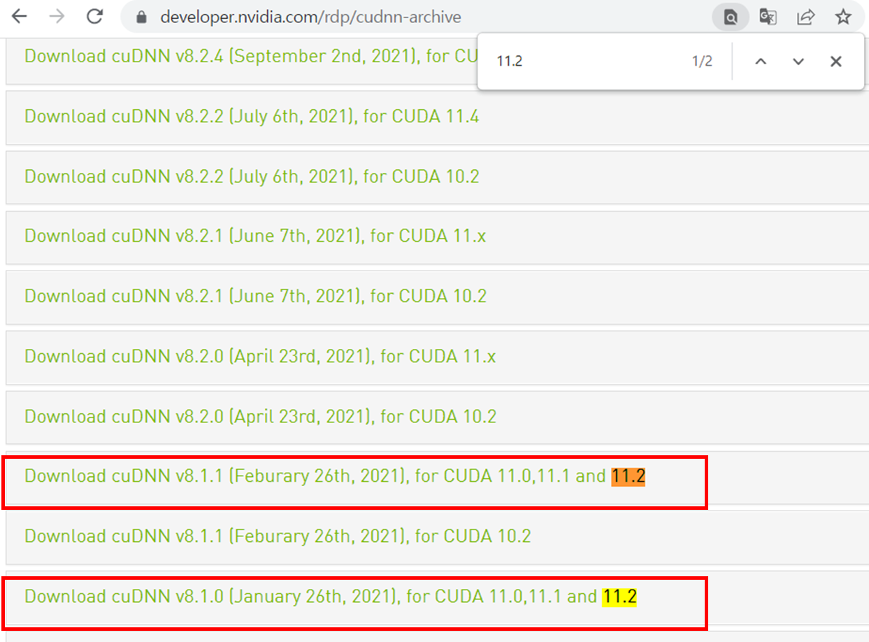 ํ์๋ 11.2 ๋ฒ์ ์ cudnn์ ๋ค์ด ๋ฐ์ผ๋ผ๊ณ ํ๋.. ์๋ ์ฃผ์๋ก ์ ์ํ์ฌ ํด๋น 11.2 ๋ฒ์ ์ cudnn์ ๋ค์ด ๋ฐ๊ฒ ๋ค.