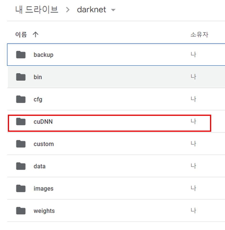 ๋์ถฉ ๋ณด๋ content ์ gdrive์ mydrive ์ darknet์ cudnn์์!! ๋ฐฉ๊ธ ๋ค์ด ๋ฐ์ cudnn ํ์ผ์ด ์์ด์ผ ํ ๊บผ ๊ฐ์ ๊ฐ์ด ์จ๋ค.