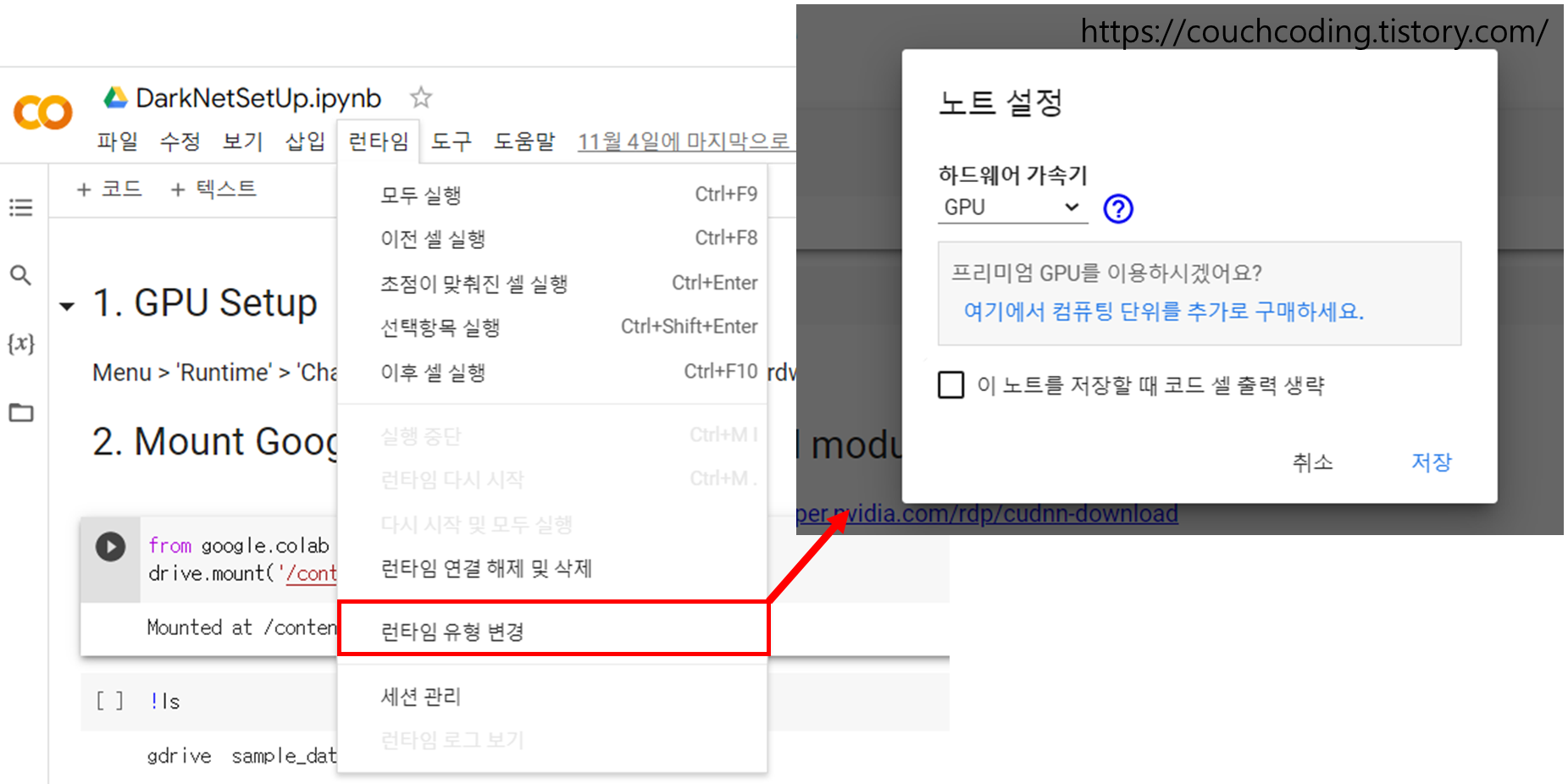 1. ๊ตฌ๊ธ ์ฝ๋ฉ(https://colab.research.google.com/) ์ ์ํ์ฌ '๋ฐํ์'>๋ฐํ์ ์ ํ ๋ณ๊ฒฝ > ํ๋์จ์ด ๊ฐ์๊ธฐ๋ฅผ "GPU" ๋ก ์ค์ ํ์ฌ ์ ์ฅ ๋ฒํผ์ ํด๋ฆญํด์ค๋๋ค.