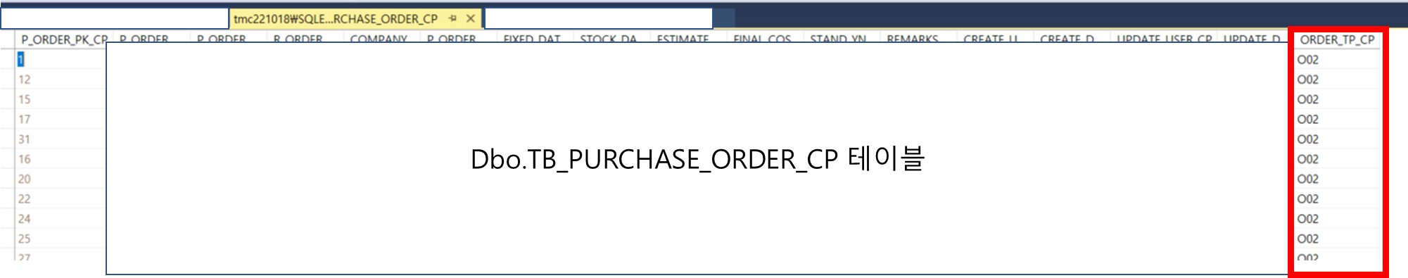 [DBO].[TB_CODE_CP] 테이블에서 CD_NM_CP 값을 조회할거다!. (==발주 or 입고)