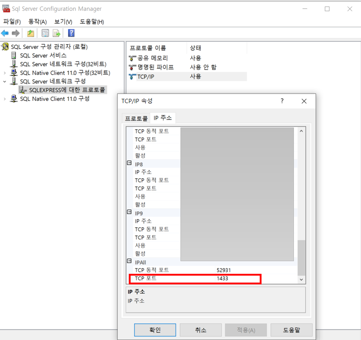sqlserver 구성관리자 > sql server네트워크 구성 > sqlexpress에 대한 프로토콜> tcp/ip > ip주소 탭 >