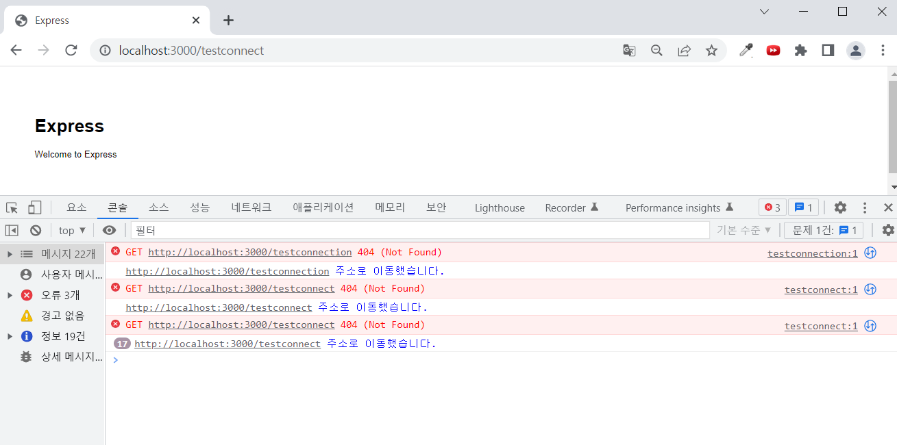 그리고.. localhost:3000/testconnect 로 접속하면 터미널에 연결된다는 문구가 떠야한다.