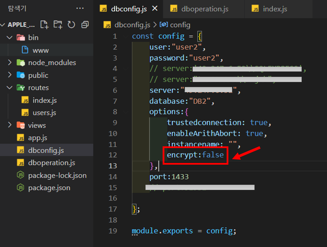 위에서 dbconfig.js 파일을 만들때,,, options 에 encrypt:false 를 추가해주었더니 실행이 되었다.