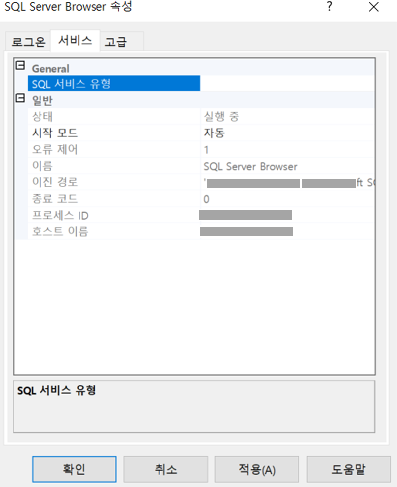 처음에는 'sql server 구성 관리자' > sql server 서비스 > SQL server browser 의 상태가 중지됨 으로 되어있었다.