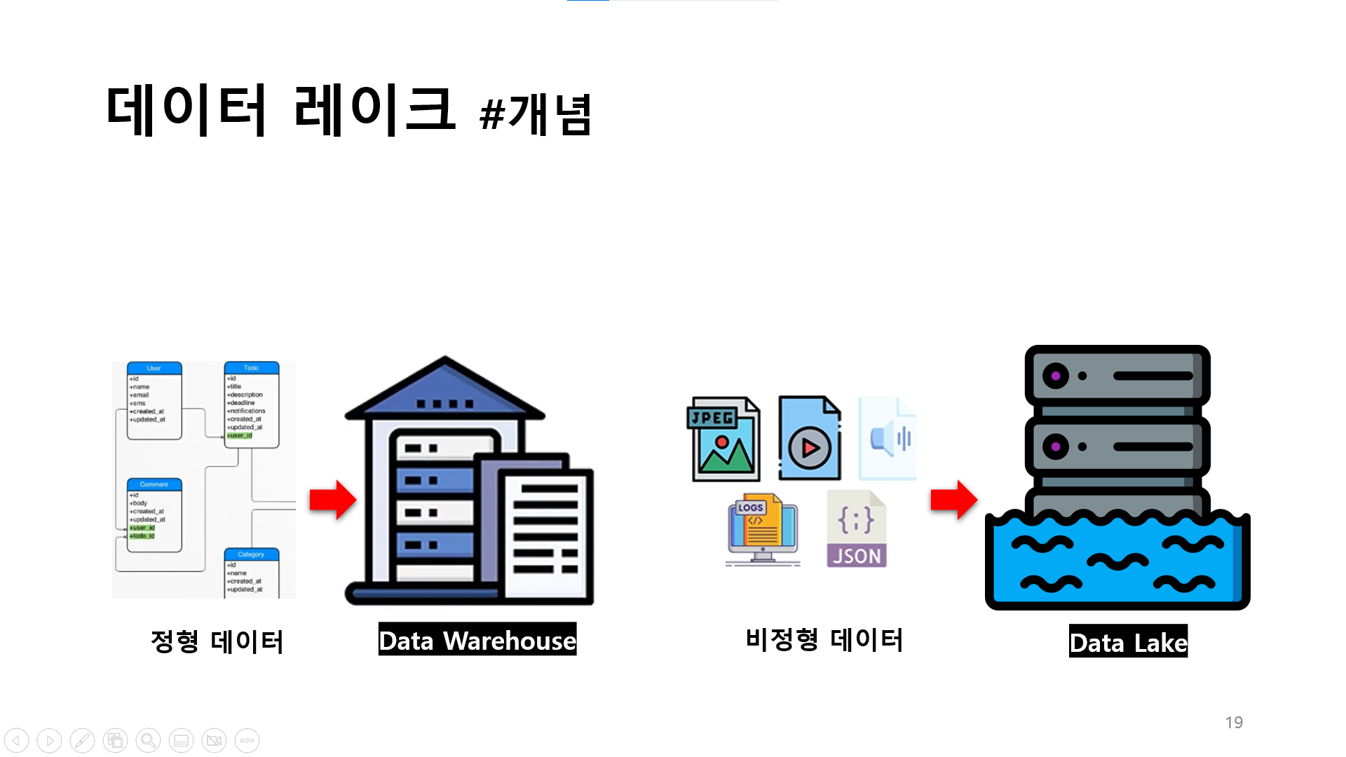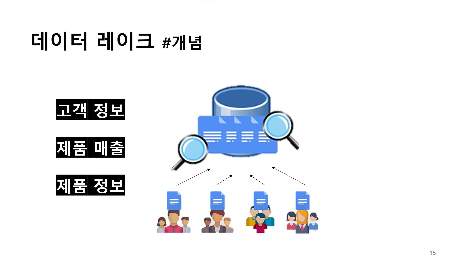 정형 데이터뿐만 아니라 다양한 유형의 용량의 큰 비정형데이터들도 분석하기 위해 탄생한 새로운 데이터 저장소가 데이터레이크 라고 보시면 되겠습니다