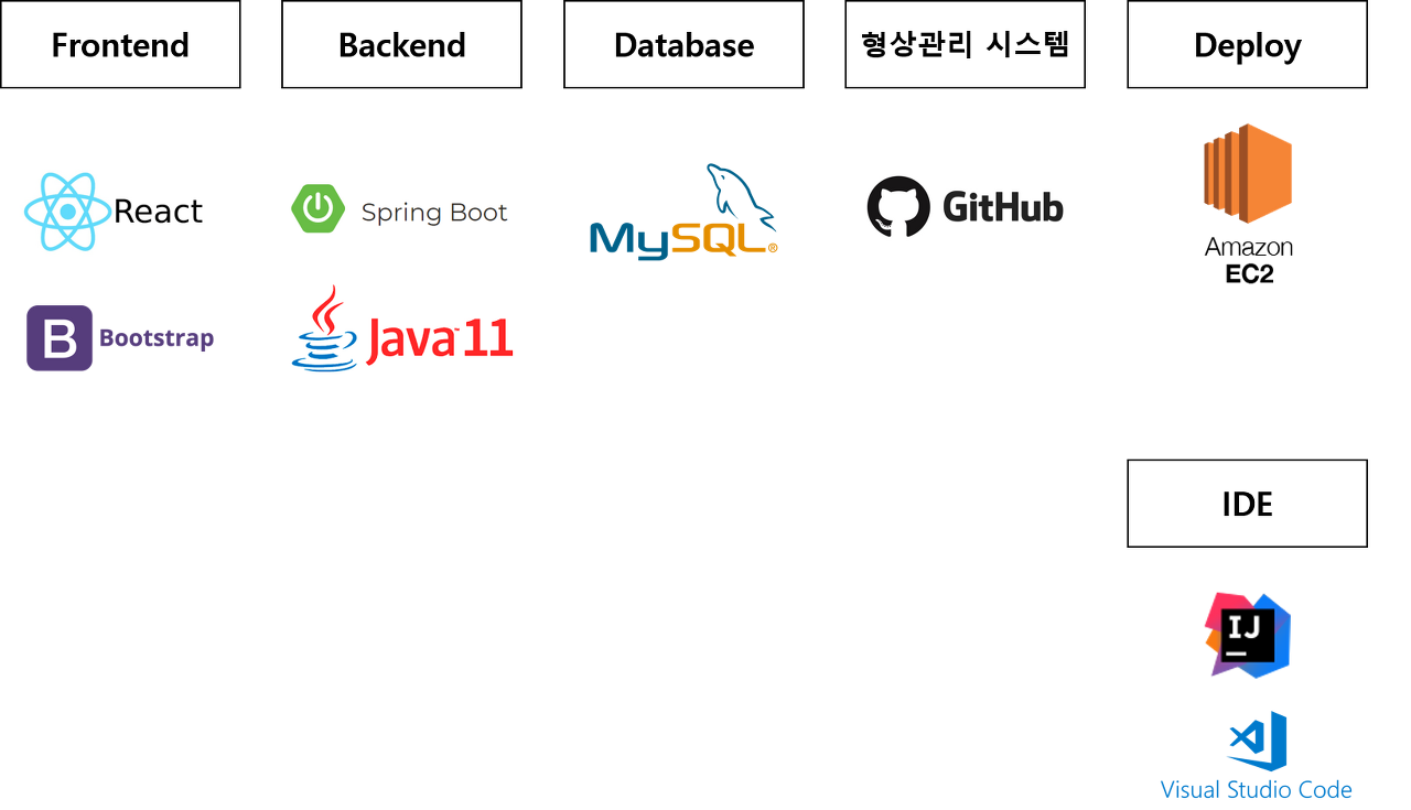 Frontend ๋Š” React ๋ฅผ Backend ๋Š” spring boot ํ”„๋ ˆ์ž„์›Œํฌ๋ฅผ ์‚ฌ์šฉ, DB๋Š” mysql , IDE(ํ†ตํ•ฉ๊ฐœ๋ฐœํ™˜๊ฒฝ)์€ Frontend ๋Š” vscode ๋ฅผ ์‚ฌ์šฉํ–ˆ์œผ๋ฉฐ, Backend๋Š” IntelliJ (์ธํ…”๋ฆฌ์ œ์ด)๋ฅผ ์‚ฌ์šฉํ•˜์˜€์Šต๋‹ˆ๋‹ค.