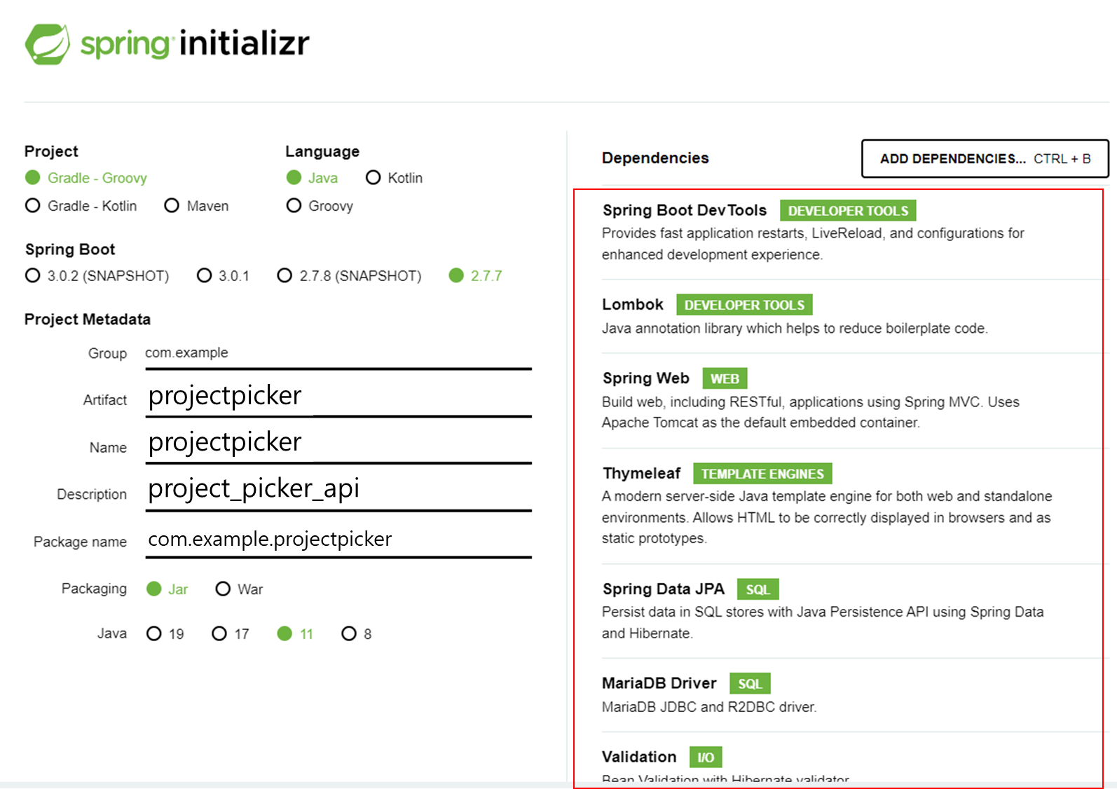 https://start.spring.io/ ๋ผ๋Š” ์‚ฌ์ดํŠธ์—์„œ ๋จผ์ € ํ”„๋กœ์ ํŠธ๋ฅผ ๊ฐ„๋‹จํ•˜๊ฒŒ ์ƒ์„ฑํ–ˆ์Šต๋‹ˆ๋‹ค.