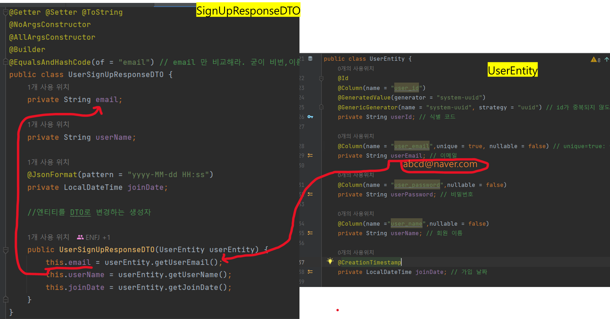 ์ด,, ๊ทธ๋ฐ๋ฐ ์ ๋ฒ์๊ฐ์ ๋ง๋ค์๋ UserSignUpDTO ์ ๋ค๋ฅด๊ฒ ์ด๋ฒ์๋ ์ํฐํฐ๋ฅผ DTO๋ก ๋ณ๊ฒฝํ๋ ์์ฑ์๊ฐ ์๋ค!