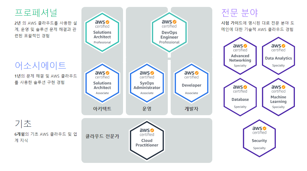 대학생은 AWS Associate 수준이 일반적이라고 하는데,, 향후 해당 분야에 취업까지 생각하고 있다면 Professional(고급) 과정 까지 취득하는게 좋다고 합니다.