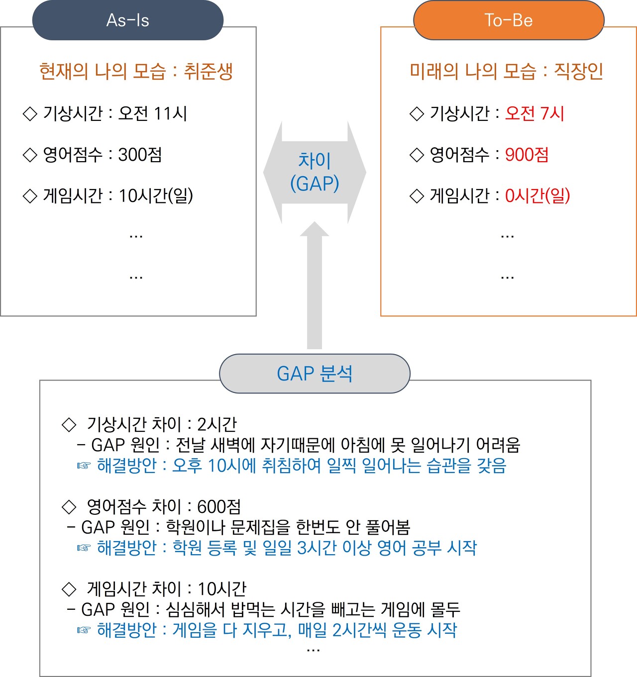 즉, 갭(gap)을 분석해서 as-is 상태를 to-be 상태로 만들기 위해 노력하는 것!
